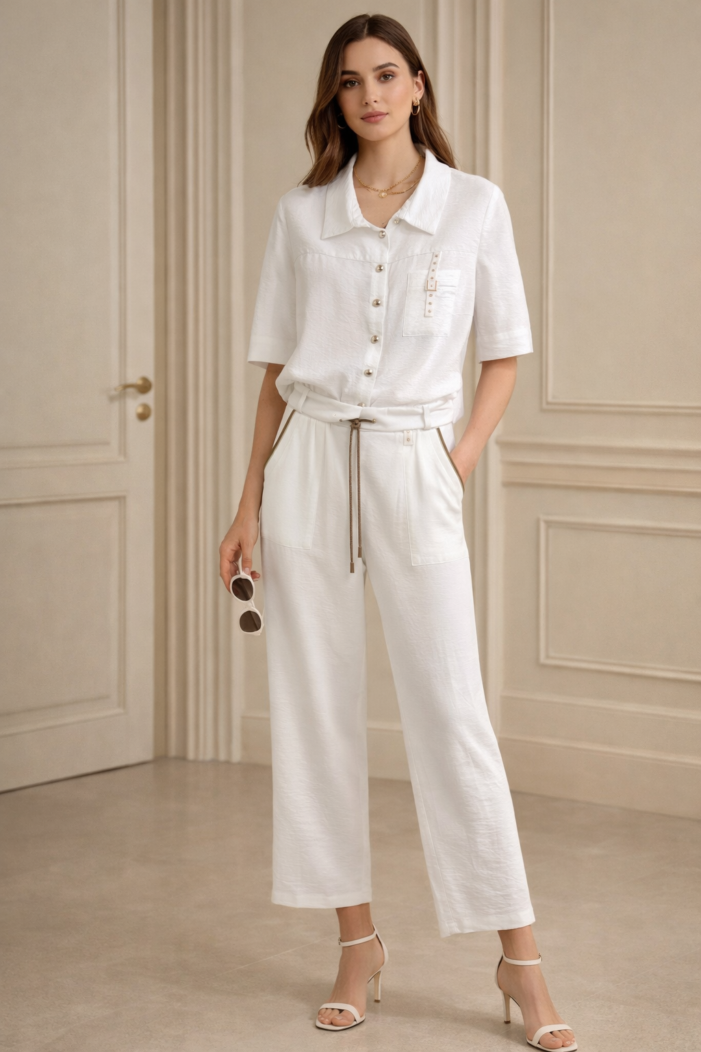 Spodnie o swobodnym, prostym kroju z wysokim stanem, który pięknie podkreśla sylwetkę. Elastyczna talia z regulacją na troczki zapewnia komfort noszenia, a subtelne wstawki przy kieszeniach dodają całości nowoczesnego wykończenia. Szeroka nogawka gwarantuje lekkość i wygodę przez cały dzień.