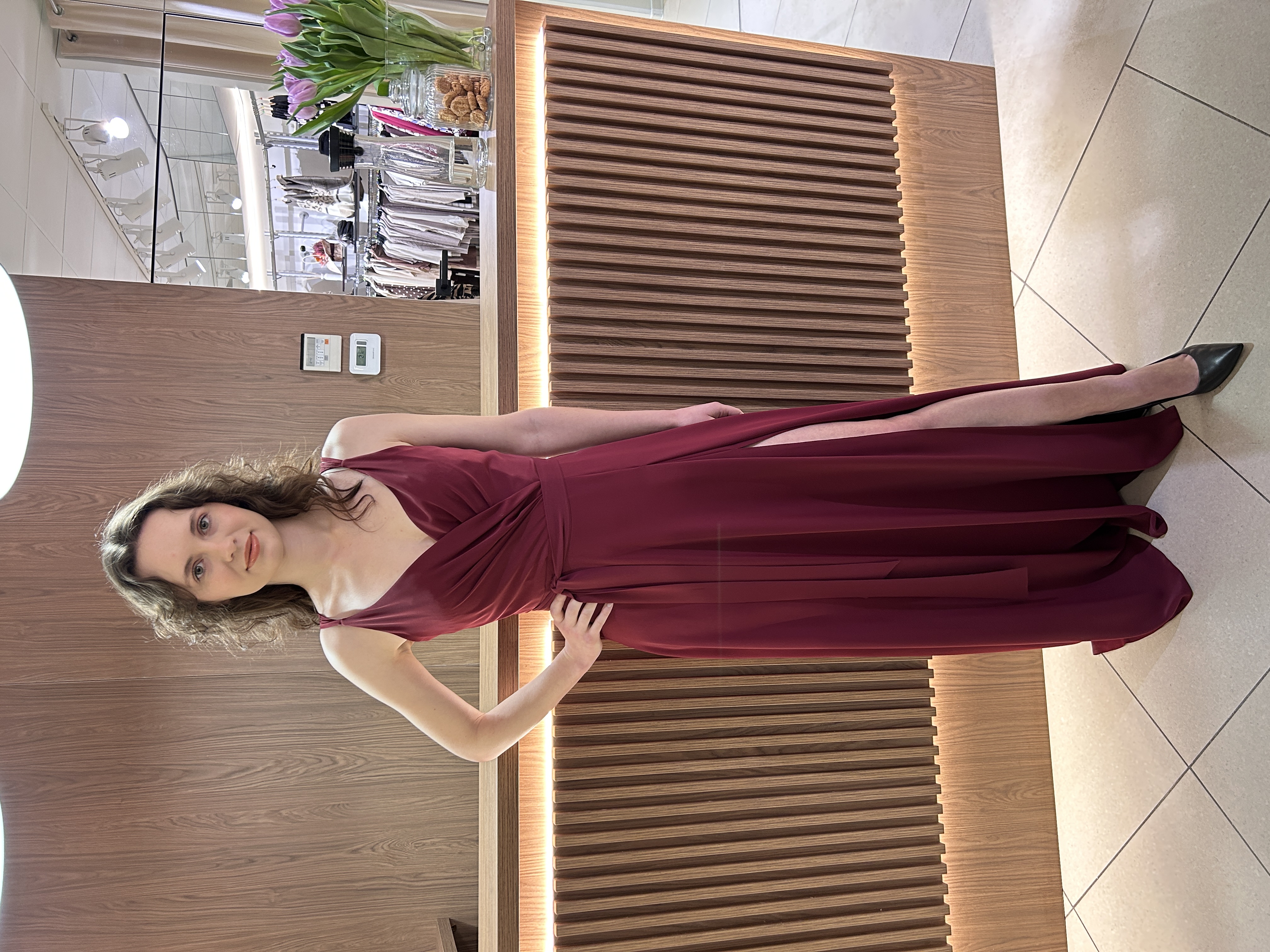 Kopertowy, drapowany dekolt z subtelnym wycięciem wysmukla szyję i dodaje klasy.